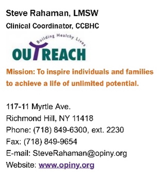 Kudos to Richmond Hill CCBHC’s Clinical Coordinator, Steven Rahaman, for including Outreach’s mission statement in his signature, a great idea! This is a simple but impactful way to publicly share our mission and purpose while reinforcing the work we do every day. If you haven’t already, consider adding the mission statement to your signature to help amplify our message across all communications. If you need help setting up your email signature, contact our Communications Manager Michael Stewart at michaelstewart@opiny.org.